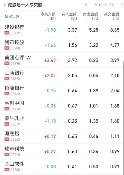 港股通今日净流入港股7.34亿港元。今日净买入美团点评3.47亿港元,工行2.01亿港元。