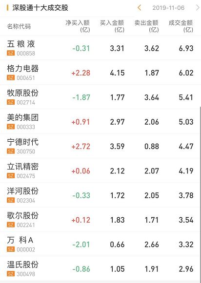 深股通净买入格力电器2.28亿,连续8个交易日累计净买入39.73亿;净买入宁德时代2.72亿,净卖出万科A2.01亿。