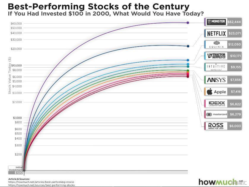其次是奈飞,同期股价暴涨了230倍;排名第三的是美国数据运营商Equinix,同期股价涨幅超过了120倍;零售店Tractor Supply的股价涨幅超过了100倍。另外,苹果排名第七,该股本世纪以来上涨了74%。
