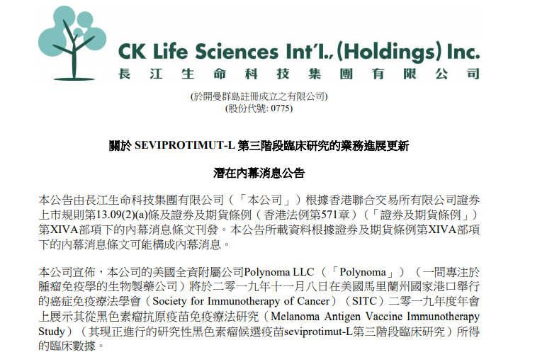 这么大的涨幅都来自于公司的一组公告,长江生命科技(00775)公布了自己“黑色素瘤抗原疫苗免疫疗法研究的初始数据喜人”的消息。