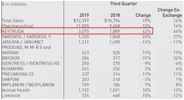 明星效应加疗效,Keytruda成为默沙东的头号明星产品。2019年10月29日,默沙东发布2019年Q3业绩报告,前三季度全球销售收入349.72亿美元,其中Q3销售收入为124亿美元,同比增长15%。而单独的K药第三季度全球销售额为30.7亿美元,同比增长62%,2019年前3季度销售额总计达79.73亿美元。