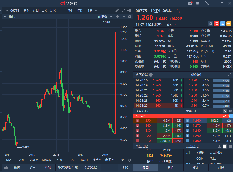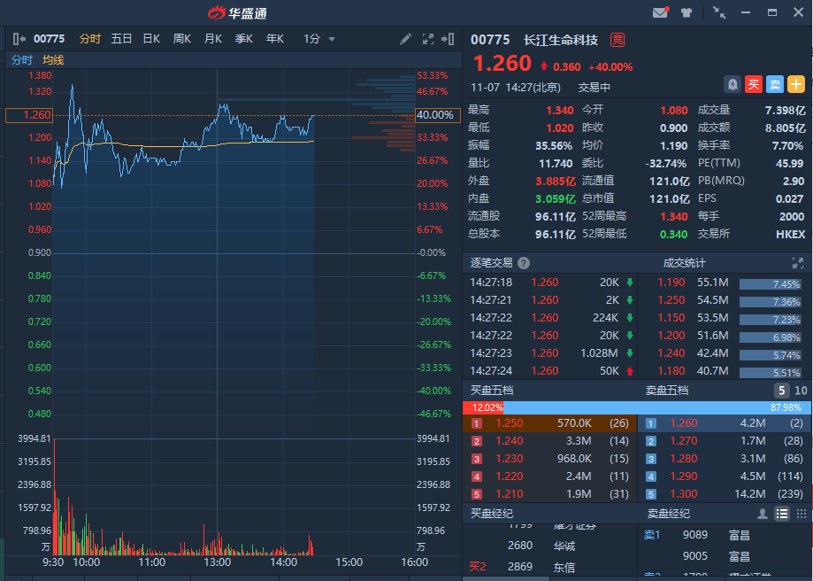 今日李嘉诚家族旗下的长江生命科技截至目前再度大涨40%,公司昨日暴涨超153.2%,从11月6日开盘价到今天的最高点计算,最高涨幅达2.7倍。