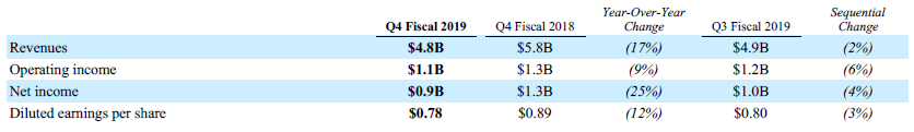 股票回购:Q4宣布300亿美元股票回购计划,截至2019年9月29日仍有71亿美元的授权回购。10月15日宣布派发每股0.62美元的现金股利,将于2019年12月19日支付。