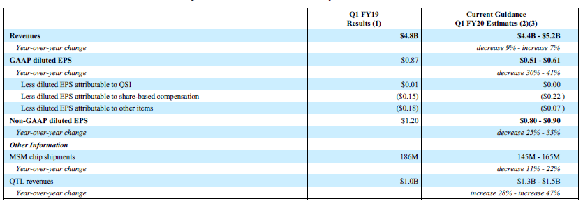 预计四季度MSM(含基带芯片的处理器)芯片出货量1.45-1.65亿,同比下滑11%至22%;中值1.55亿高于市场预期的1.498亿。