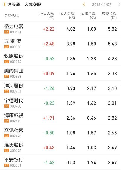 深股通净买入五粮液2.48亿、海康威视1.91亿、格力电器2.22亿。