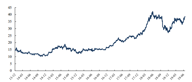 在Moncler强大的品牌基因叠加成功的战略转型,在2011-2018年期间收入年复合增长率达21%,门店数量年复合增长率达21.0%,利润的年复合增长率达28%,对应股价自13年底上市以来一路上行,至18年6月达到高点42欧元,累计股价涨幅超过190%。