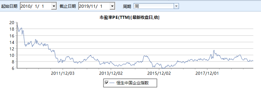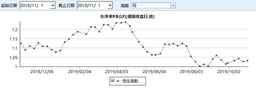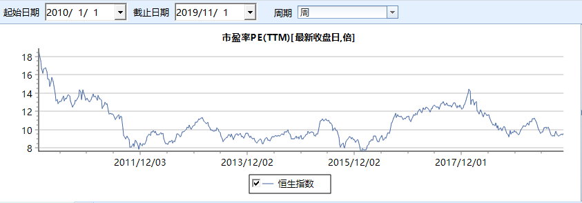 2019年,经过剧烈下跌,港股的投资价值已经无比显著。恒生指数的滚动市盈率和市净率都位于历史低位,恒生指数市盈率9.61,历史均值为14.3倍。恒生指数的市净率1.03,历史均值为1.3倍。
