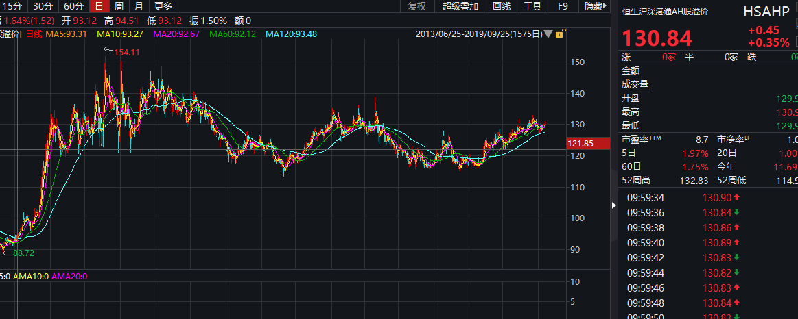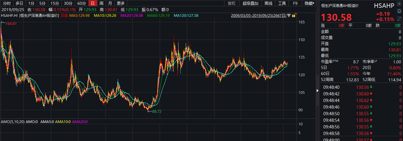 AH溢价指数正告诉我们投资机会来了。恒生AH溢价指数就是用来计算这些在A股和H股同时上市公司的价格差异。当一段时间内,A股公司相对于H股涨幅过快的时候或H股相对于A股下跌过快时,AH溢价指数就会迅速的上涨。