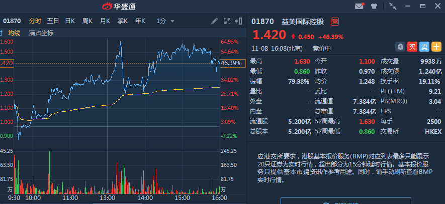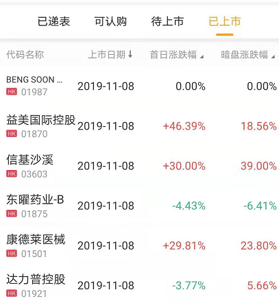 其中,益美国际控股涨幅后来居上,截止收盘涨46.39%,报价1.42港元,若以发行价买入,一手赚1125港元,成交额1.24亿港元,市值达7.384亿港元。