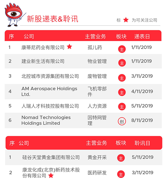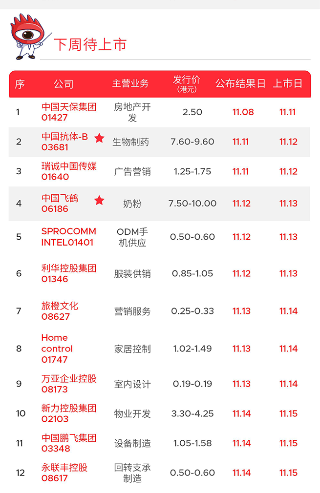 首日表现最佳的要数外墙装修商益美国际,收盘大涨46.4%;而超购倍数最多的康德莱医械首日一手最高赚1840港元!而字母股在本周表现就比较一般了。再来看看下周要上市的新股: