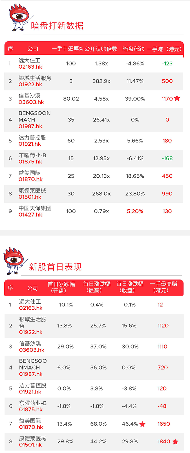 暗盘整体表现向好,实现了6只收涨!收益最高的是酒店用品商信基沙溪,一手收益1170港元;