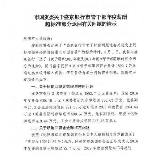 事发今年3月1日,沈阳市国资委向盛京银行下达了《关于退回2016年度及2017年度市管干部薪酬超标准部分的通知》,同日盛京银行3名市管干部退回资金共计1892. 7万元通过盛京银行缴入国资委。