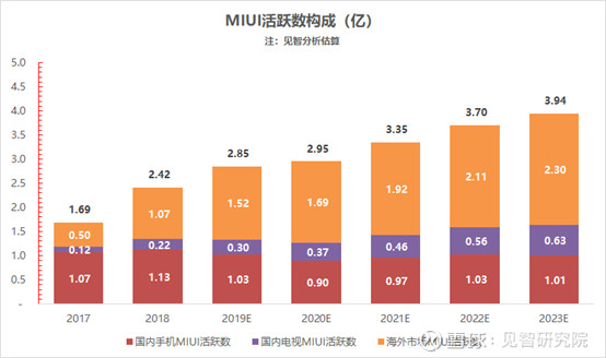 (3)在国内互联网部分,小米MIUI月活,实际上包括手机MIUI月活和电视MIUI月活两块,在下面的分析中,我们会看到,手机MIUI月活实际上已经停止增长,并面临进一步下降风险;电视MIUI月活在保持快速增长;