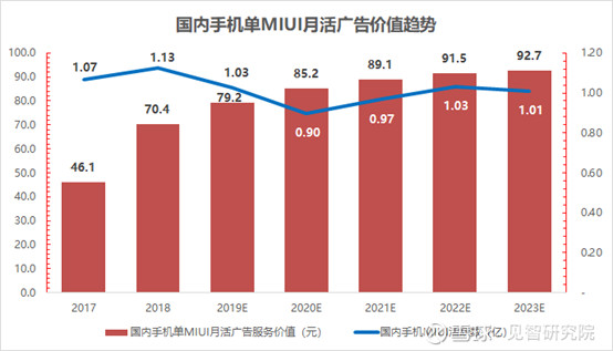 (8)当我们讨论小米互联网板块单用户价值时,会把其拆分为单用户广告价值和单用户增值服务价值两个部分。在下面的分享中,我们会看到,基于行业因素,手机MIUI单用户广告价值已经难以增长,电视MIUI单用户广告价值虽然可以维持20%左右的增长,但应占比较小,难以成为营收增长的新引擎;在增值服务方面,单用户增值服务价值进入低速增长区间,已经是共识;