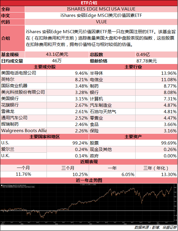 摩根大通的量化大师强烈推荐价值股,称其跑赢大盘趋势将持续至2020年,而VLUE.US就是典型的追踪价值股的ETF。