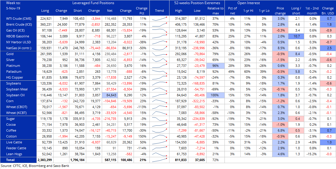 The below summary highlights futures positions and changes made by hedge funds across 24 commodities futures up until last Tuesday, November 5. The reporting period covered a week where trade deal optimism continued to run high with stocks and bond yields both rising while the prospect for further U.S. rate cuts continued to deflate.