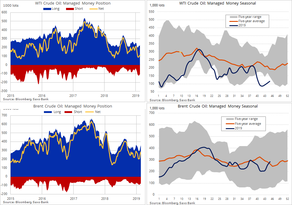 Bets on rising energy prices rose by more than 100k lots in the week to November 5. Trade optimism and the prospect for further OPEC supply cuts supported a third weekly increase in WTI (+12k lots) and Brent (+28k lots) crude oil longs. During the past three weeks funds have bought 109k lots, still less than the 180k lots that was sold the previous three weeks.