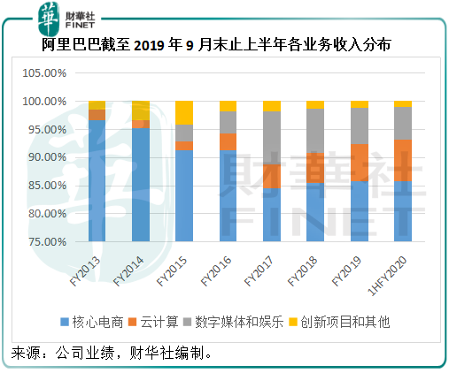 截至2019年9月底止的上半年(2020财年上半年),阿里巴巴的收入同比增长40.87%,至2339.41亿元,其中最重要的两项收入来源——核心电商业务和云计算业务保持41.72%及64.77%的强劲增长。经调整EBITA增长34.21%,至666.47亿元。归属于股东盈利为898.7亿元,同比增长2.47倍,若扣除蚂蚁金服的一次性确认收益以及其他非经常性款项,阿里巴巴上半年的经常性业务盈利或为636.99亿元,同比增长46.25%。上半年的自由现金流达到568.49亿元,同比增34.11%。