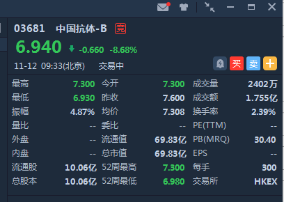 中国抗体-B昨日暗盘低开平收,收报7.6港元,若以发行价买入,每手赚0港元;成交额3480万港元,总市值为76.47亿港元;瑞诚中国传媒收报1.16港元,较发行价跌7.20%,每手蚀180港元,成交额590万港元,总市值为4.639亿港元。