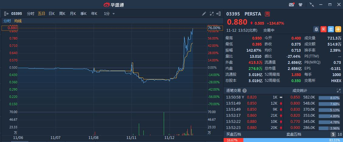 新浪港股讯,PERSTA(03395)连跌三日累挫两成半后,现价飙134.67%,报0.88元,暂升幅最大个股,升破十天线(0.506元)及廿天线(0.562元);成交约721万股,涉资514万元。