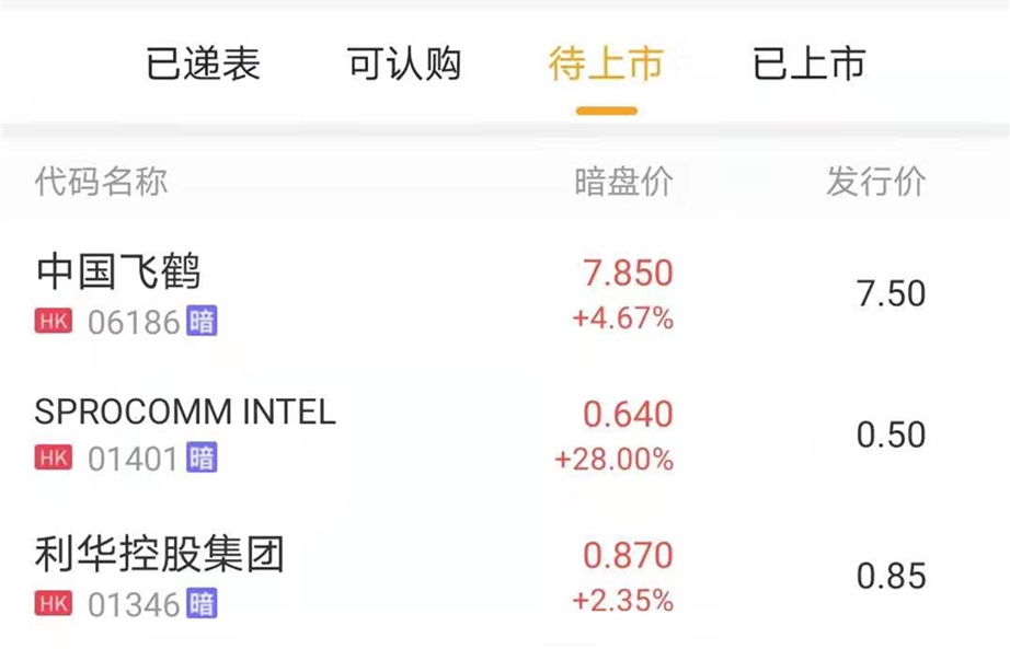 今日有暗盘交易的3只新股中国飞鹤、利华控股、Sprocomm Intelligence开盘齐涨: