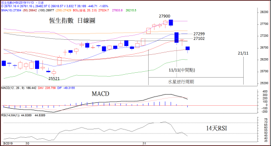 事實上,兩方面的情況都顯示恆指仍有下跌餘地:第一,在MACD剛發出沽售訊號之餘,14天RSI亦已跌至44的水平,跌勢沒有任何見底的跡象;第二,以星象周期分析,既然恆指進一步下跌,「水星逆行」周期的「中間點」應已在11月7日的27900發揮見頂作用,目前的跌勢預期可以維持至整個周期在11月21日結束為止。