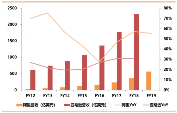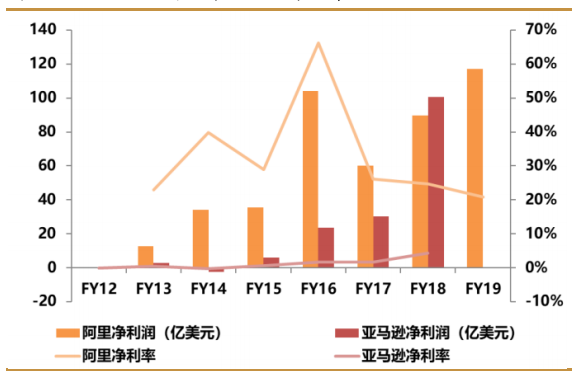 在营收上,亚马逊18财年营收 2328.9亿美元,4倍于阿里巴巴。虽然阿里营收低于亚马逊,但阿里巴巴营收增速较高,12-19 财年阿里巴巴营收复合年均增长率为 43.5%,11-18财年亚马逊复合年均增长率为21.8%。