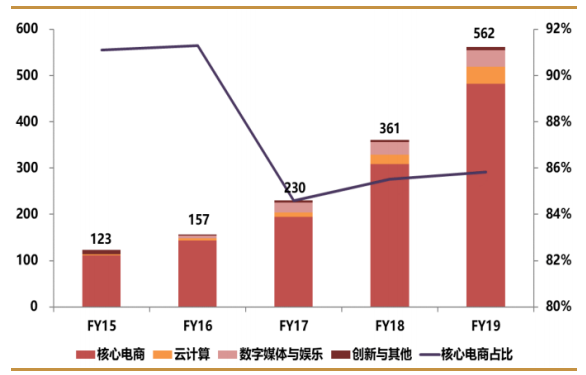 阿里从电商平台起家,电商服务收入是主要的盈利来源,云计算业务亏损率已大幅收窄至接近盈亏平衡点,新零售等业务也在蓬勃发展中,但核心商务仍然是其主要盈利的部分,新业务的发展才能打开市场未来对阿里巴巴的想象力。