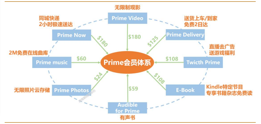 亚马逊于2005 年推出Prime 会员制度,利用高速物流和增值服务提升客户消费频率和消费额度,留住老客户的同时吸引新客户,进一 步扩大客户流量。