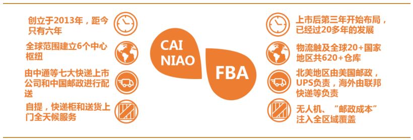 菜鸟网络和FBA的物流体系都是以“信息”、“仓储”和“配送”三个环节为中心,但亚马逊FBA开始较早,并且投入较大,发展也比菜鸟网络更成熟。