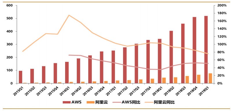 AWS 2019 年 Q1 营收达到 518.1 亿元,同比增长 51.4%。AWS 的营收增长较为平稳,其营业收入的绝对值在 2019Q1 是阿里 云的 6.7 倍,在行业地位和体量上依旧碾压经历了爆发式增长的阿里云。