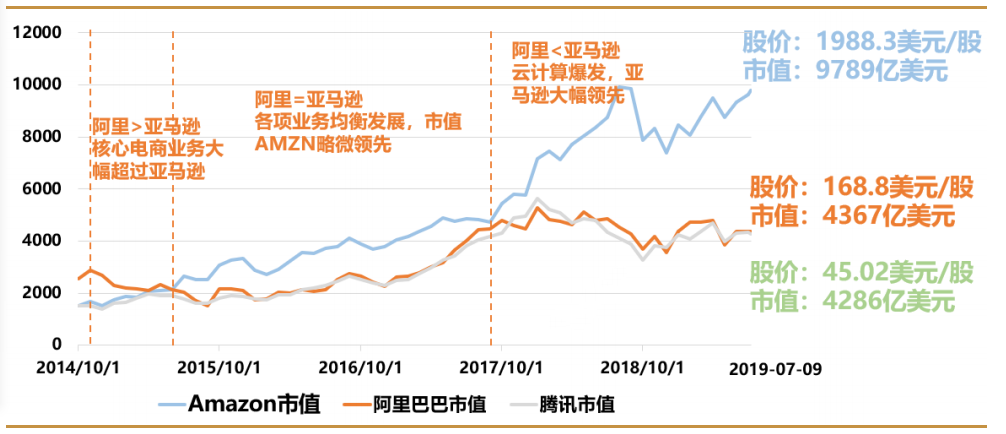截止2019年11月12日,阿里巴巴市值4867.90亿美元,亚马逊总市值8815.27亿美元。从阿里巴巴上市这几年看,涨幅小于亚马逊,这个原因可能与市场环境、发行价、竞争环境、商业模式与估值思路等有关。