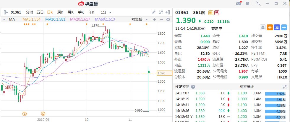 智通财经APP注意到,11月14日,361度股价盘中突然“跳水”,跌幅一度接近40%,股价最低下探至0.99港元,直接“成仙”。
