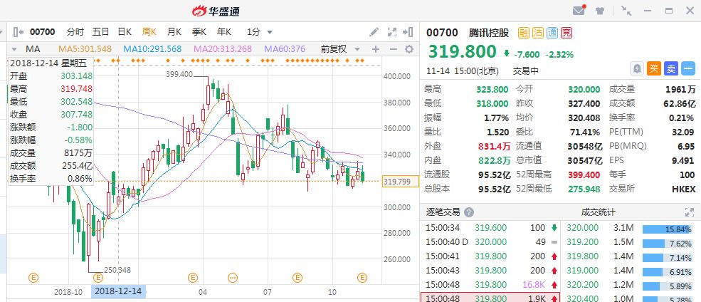 新浪港股讯 11月14日消息,腾讯第三季度营收、净利均不及预期,股价低开2.26%,报价320港元。