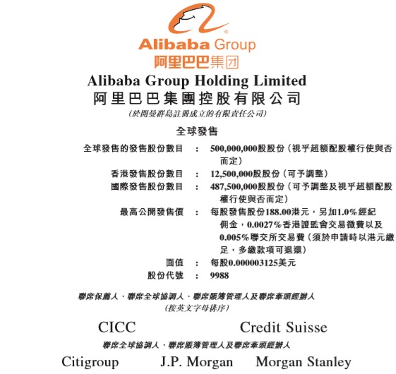 阿里拟发行5亿股新股,并设15%或7500万股超额配售权,即最多发售5.75亿股,市场传出其每股最高招股价为188元,以每手100股计,入场费约18989元,计及超额配售最多集资约1081亿元,仅次于2010年集资1590亿元的友邦、2006年集资1249.5 亿元的工行,有望成为香港史上第三大的IPO,亦是今年以来全球最大型IPO。