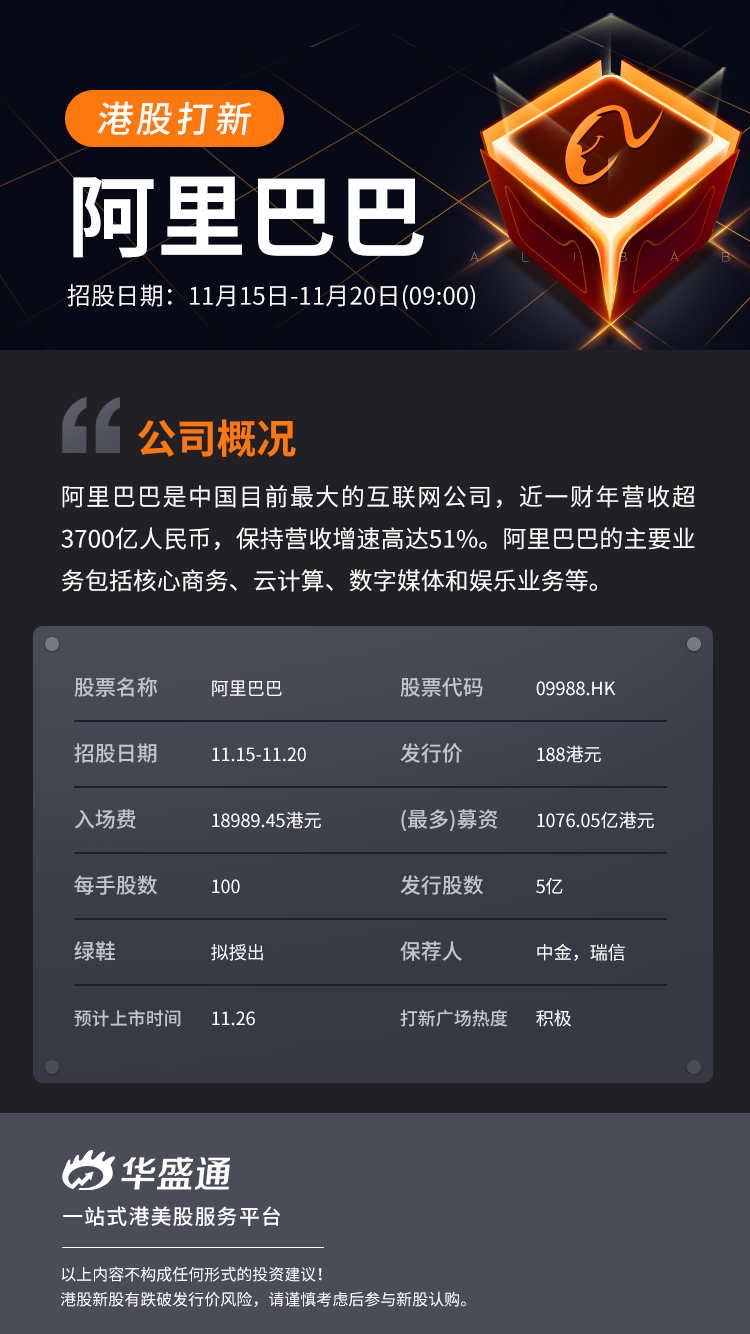 阿里巴巴今日宣布,于2019年11月15日启动作为全球发售一部分的香港公开发售。本次发行将新发行5亿股普通股新股,是由公开零售发售下1250万股新发行股份及4.875亿股供国际认购的新发行股份组成集团普通股。