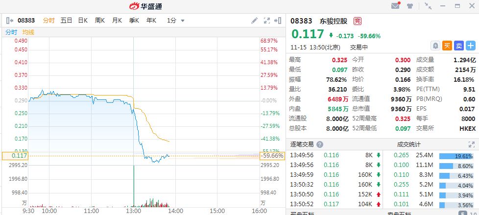 新浪港股讯,东骏控股(08383)现挫60.34%,报0.115元暂为跌幅最大个股,盘中见0.105元,创历史新低;成交约5502万股,涉资1344万元。