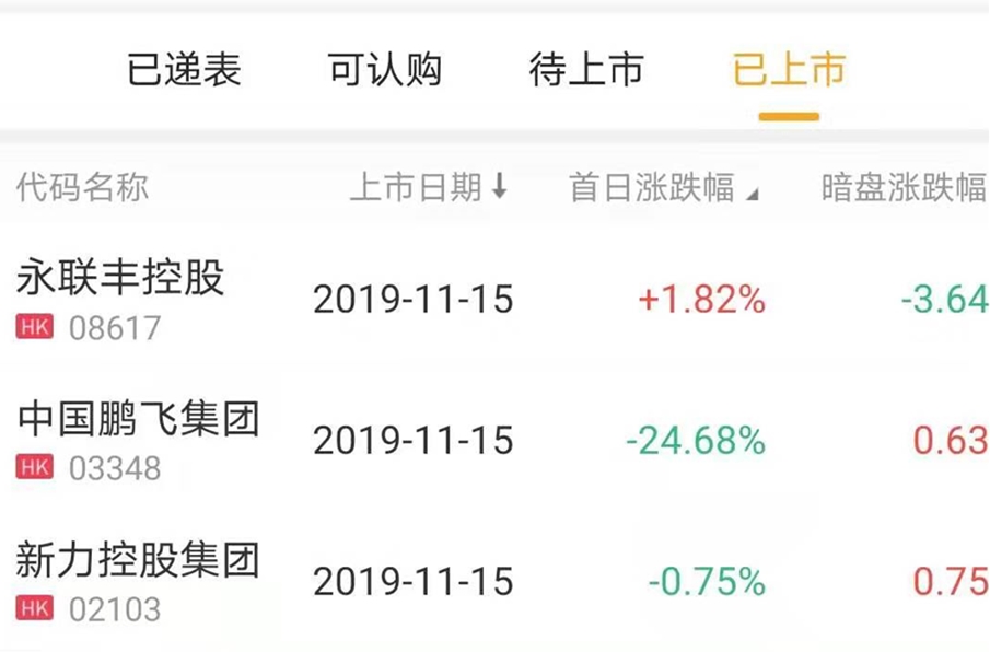新力控股微跌0.75%,报价3.95港元,若以发行价买入,一手蚀30港元,成交额2.25亿港元,市值达139.41亿港元。
