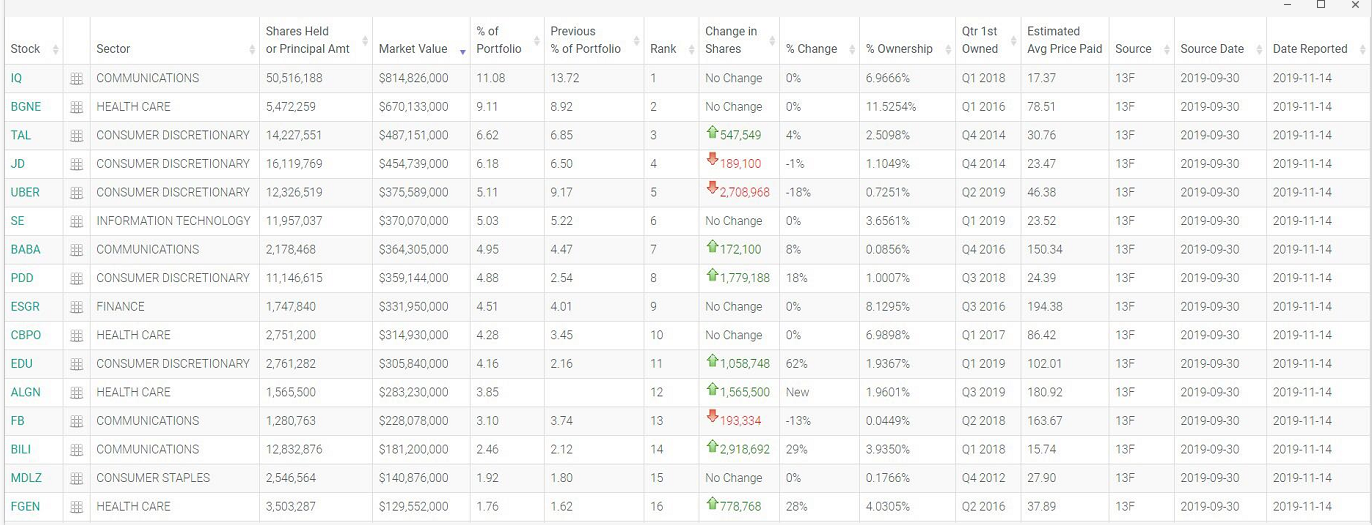 按持仓价值算,美股前五大重仓股分别为:爱奇艺(11.08%,持仓不变)、百济神州(9.11%)、好未来(6.62%)、京东(6.18%)以及Uber(5.11%),持有市值分别达8.1亿美元、6.7亿美元、4.8亿美元、4.5亿美元及3.7亿美元。阿里巴巴和新东方持仓仍保持3亿美元以上,百济神州跃居为第二大持仓股。三季度维持对苹果、搜狐、SNAP等33家公司的持仓不变。