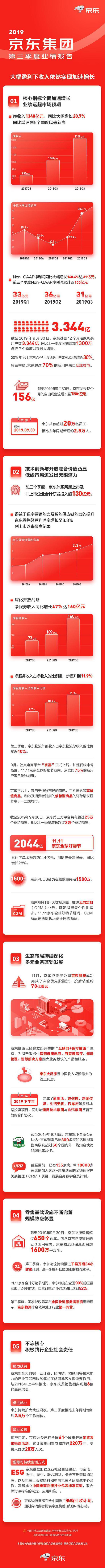 财报显示,截至2019年9月30日,京东过去12个月的自由现金流增长至156亿元,同比与环比均大幅提升;过去12个月的活跃购买用户数为3.344亿,环比二季度同期新增1300万,创下近7个季度以来最大增量。截至2019年9月30日,京东集团共拥有超过20万名员工。