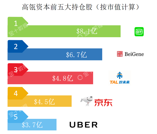 高瓴资本三季度的前五大重仓股分别是:爱奇艺、百济神州、好未来、京东和UBER。此外,阿里巴巴、新东方的持有市值继续保持在3亿美元以上。