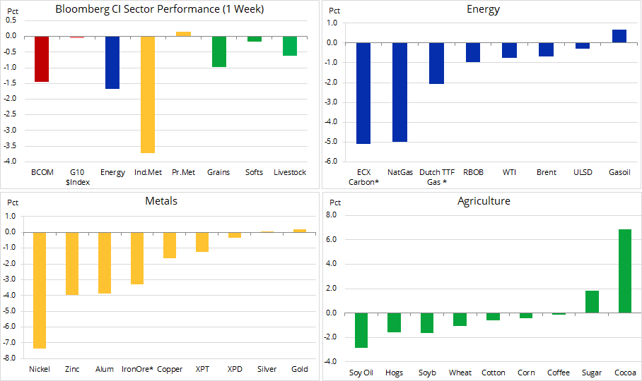 The Bloomberg Commodity Index, which tracks the performance of 22 futures markets across energy, metals and agriculture traded lower for a second consecutive week. The global growth outlook and with that future demand for many key commodities remain challenged by the prolonged trade war between the U.S. and China.