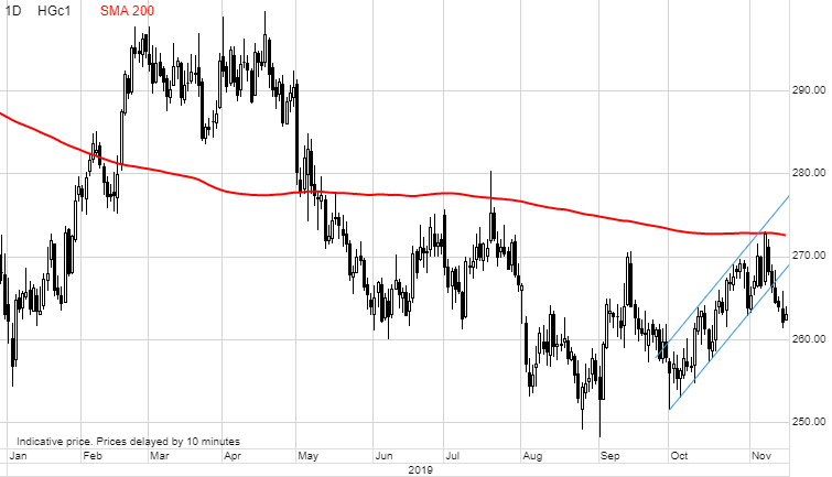The rally in High Grade copper, a bellwether for global growth and demand, has run out of steam after being rejected at $2.725/lb, a level corresponding to its 200-day moving average. Social unrest in Chile, a major producer, and the prospect for a trade deal helped drive a short-covering rally since early October. But with short positions now much reduced, further upside hinges on whether real demand emerges following a deal, especially from China.