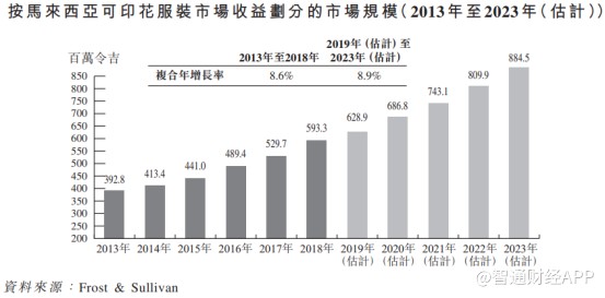 受可印花服装消费者需求持续增长的影响,马来西亚可印花服装市场收益由2013年的约392.8百万令吉增至2018年的约593.3百万令吉,复合年增长率为8.6%。根据政府对促进国家经济及增加个人收入的扶持性政策,可印花服装成衣市场预期在未来五年继续增长,到2023年达到约884.5百万令吉,2019年至2023年的复合年增长率约为8.9%。