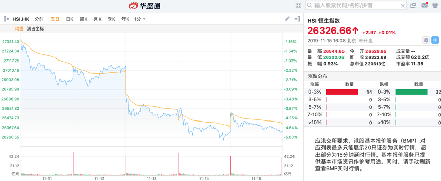 上周,受香港本地事件等因素的影响,恒生指数一路低走。截至周五收盘,恒生指数一周累计跌幅达4.79%,收报26326点,抹去此前四周的涨幅。
