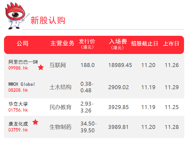 上周迎来了阿里巴巴正式招股,整个新股市场异常兴奋,阿里巴巴将是首家同时在香港和美国上市的互联网巨头,也将是今年港股最大IPO!散户认购截至11月20日,并于当日出最后定价。最终公开零售发售价将为最终国际发售价和最高公开零售发售价(每股188.00港元)的较低者,将以每手100股股份为单位进行交易。