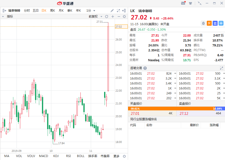 上线仅两年之久的瑞幸咖啡,决心在今年赶超星巴克。周五公司股价暴涨25.44%,创下了上市以来的新高,公司13日发布盘前Q3财报,业绩超出市场预期,当日大涨13.07%。从季报发布开始算,三天时间股价累计上涨幅度达42.36%,市值突破63.6亿美元。