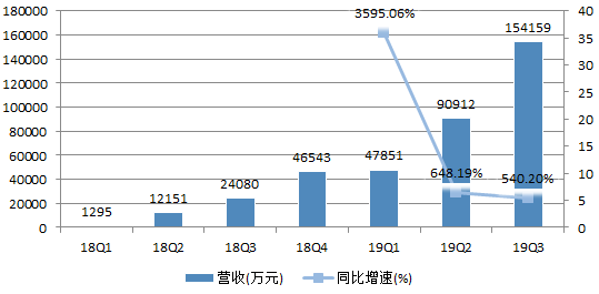 从收入端,瑞幸19Q3总净收入15.41亿元,同比增长540.2%,其中来自产品的总净收入14.93亿元,同比增长557.6%。分部中的主打现酿饮品前三季营业收入21.66亿元,同比增长615%,净亏损17.65亿元,Q3单季11.45亿元,环比增长70%。因开店神速,去年营收基数较低的情况下,19Q1及Q2两季度的收入同比增速分别高达35.95倍及6.48倍。