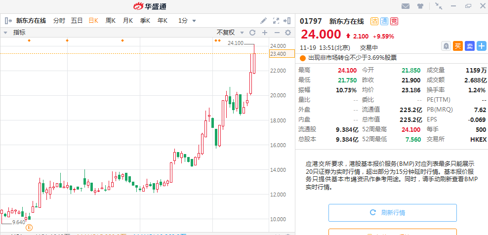 近3个月在港股市场出现了一只大牛股,那就是国内在线教育平台的先行者新东方在线。在2019年11月19日新东方在线盘中出现24.1港元的历史新高,市值最大达到226亿港元。