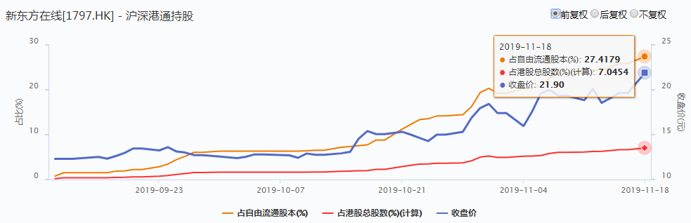 从数据监测上来看,南下资金也持续在对新东方在线加仓,截止2019年11月18日,沪深港通持股占新东方在线自由流通股本达27.42%,占其港股总股数的7%,这两项数字都是历史新高。